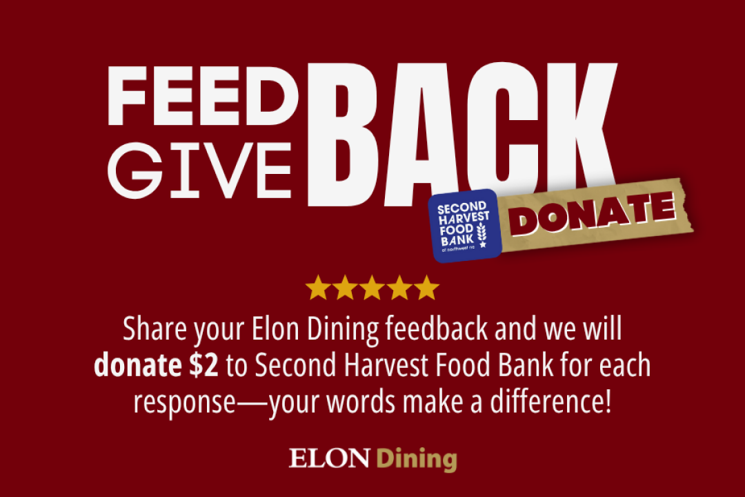 At Elon Dining, your feedback matters! We strive to continually enhance your dining experience, and we need your input to help us do that. By taking our quick, confidential survey, you can share your thoughts, opinions, and suggestions on how we can improve. Make a Difference with Your Voice! Not only will your feedback help shape the future of Elon Dining, but for every survey response we receive, we’ll donate $2 to Second Harvest Food Bank of Northwest North Carolina. Your input directly supports both your campus community and local families in need.